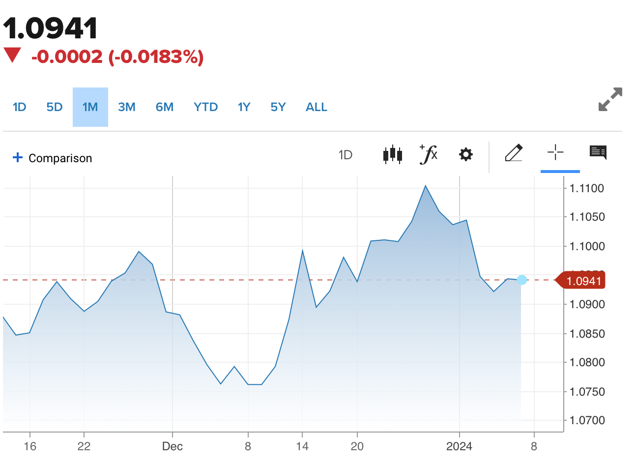 | Diễn biến tỷ giá EUR/USD trên thị trường thế giới (Nguồn: CNBC) |