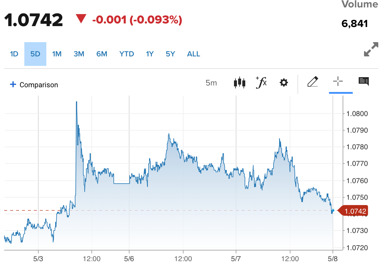 | Diễn biến tỷ giá EUR/USD trên thị trường thế giới. Nguồn: CNBC |