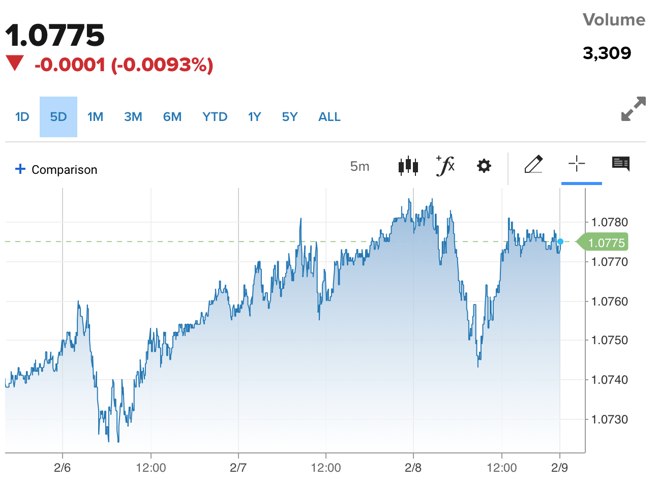 Tỷ giá Euro hôm nay 9/2/2024: Đồng Euro thế giới giảm nhẹ, đứng ở mức 1.0775 EUR/USD