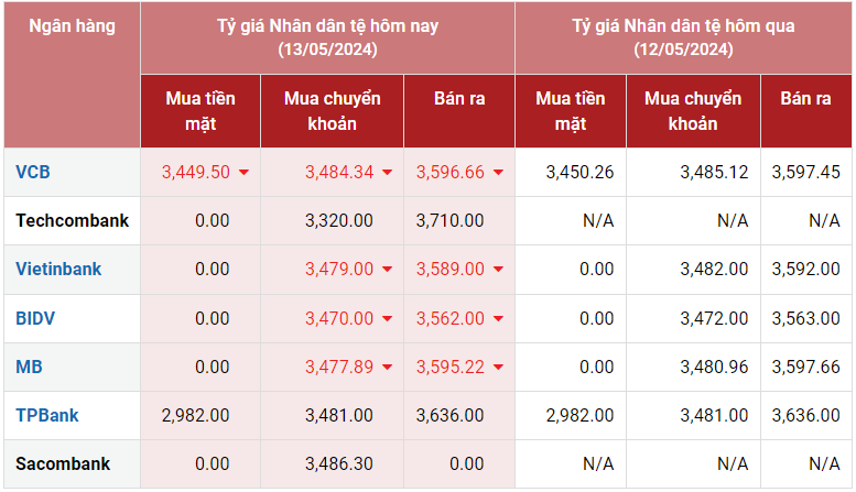 Hôm nay ngày 13/5/2024, ngân hàng mua chuyển khoản Nhân dân tệ cao nhất là ngân hàng Sacombank với mức giá 3.486,30 VNĐ/CNY.