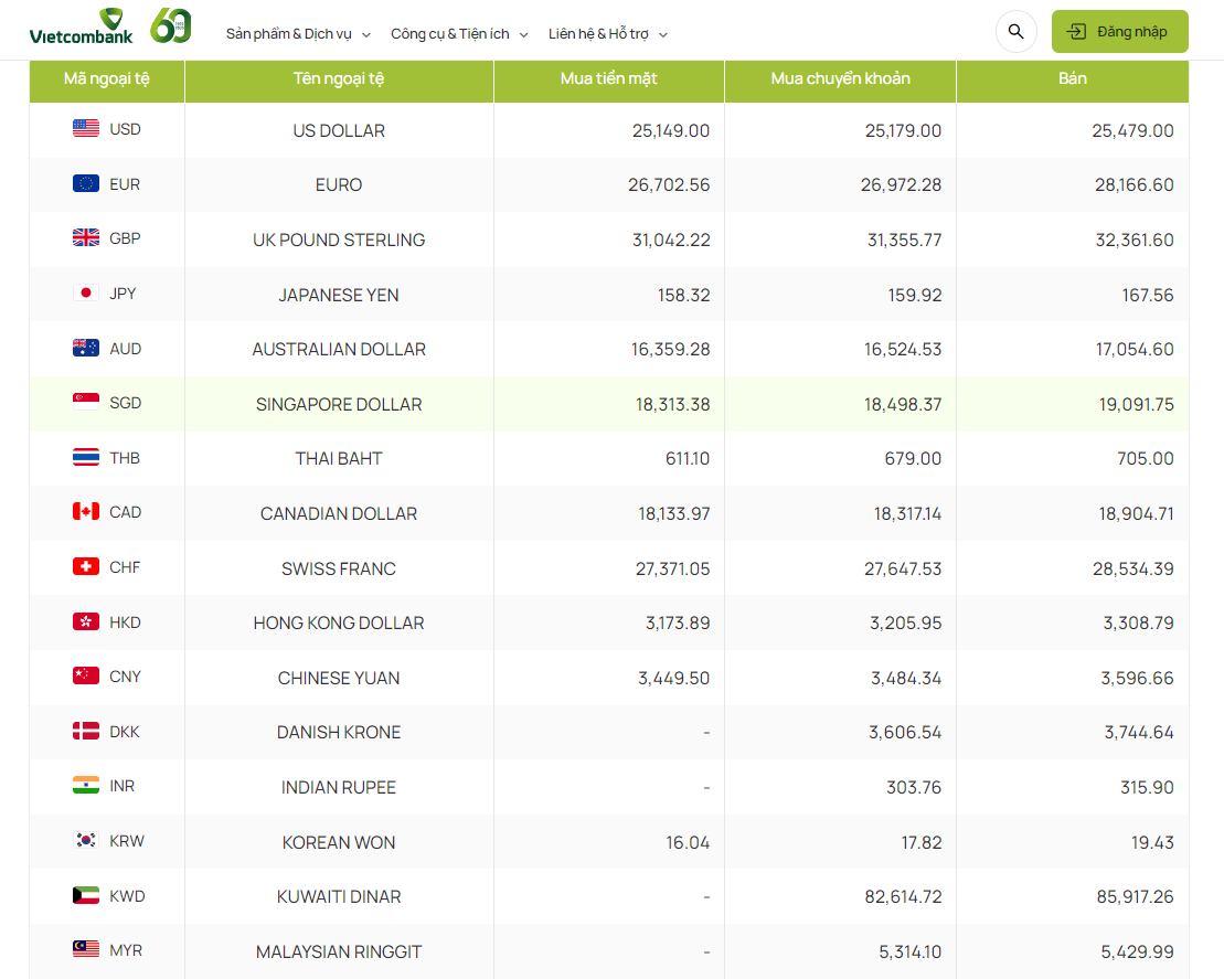 Trong số 20 ngoại tệ đang được giao dịch tại Vietcombank, chỉ có 12 loại tiền tệ được Vietcombank mua - bán bằng tiền mặt hoặc chuyển khoản đó là: Đô la Mỹ (USD), Euro (EUR), nhân dân tệ (CNY), Đô la Úc (AUD), bảng Anh (GBP), Đô la Canada (CAD), Franc Thuỵ Sĩ (CHF), Đô la Singapore (SGD), Won Hàn Quốc (KRW), Yên Nhật (JPY), Đô la HongKong (HKD), Bath Thái Lan (THB).