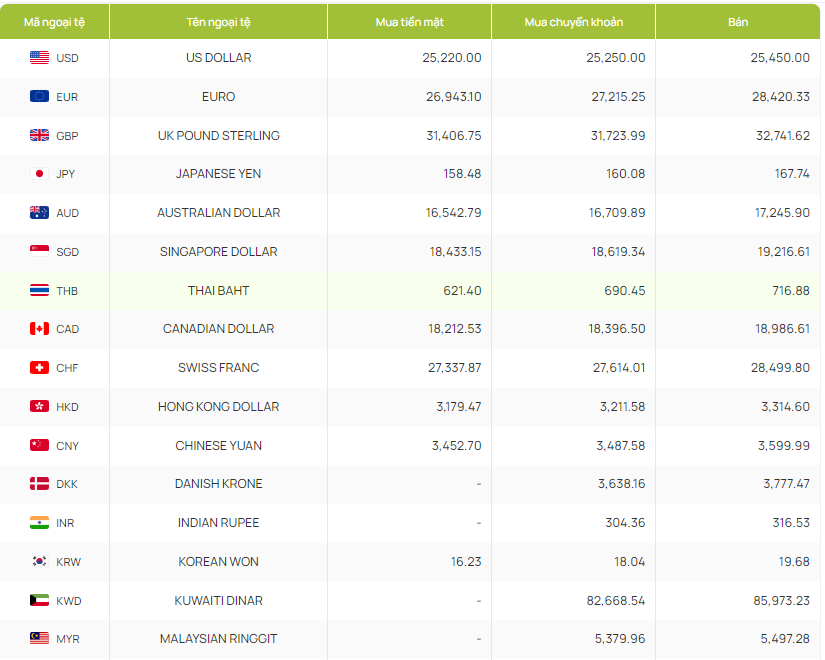 Với 8 ngoại tệ còn lại, khách hàng có thể giao dịch bằng hình thức chuyển khoản: Krone Đan Mạch (DKK), Rupee Ấn Độ (INR), Dinar Kuwaiti (KWD), Ringgit Malaysia (MYR), Krone Na Uy (NOK), Rúp Nga (RUB), Rian Ả-Rập-Xê-Út (SAR) và Krona Thụy Điển (SEK).