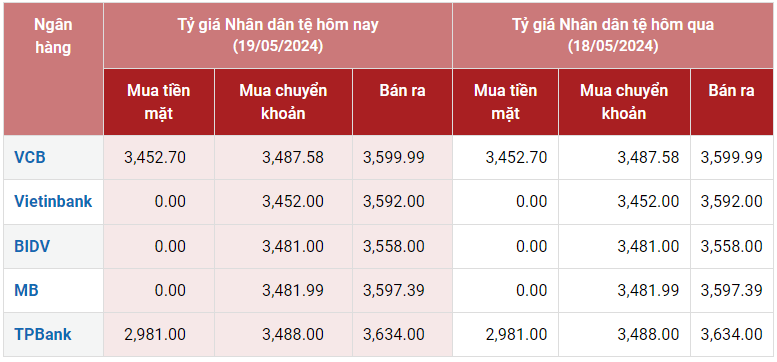 Hôm nay ngày 19/5/2024, ngân hàng mua chuyển khoản Nhân dân tệ cao nhất là ngân hàng TPBank với mức giá 3.488,00 VNĐ/CNY.