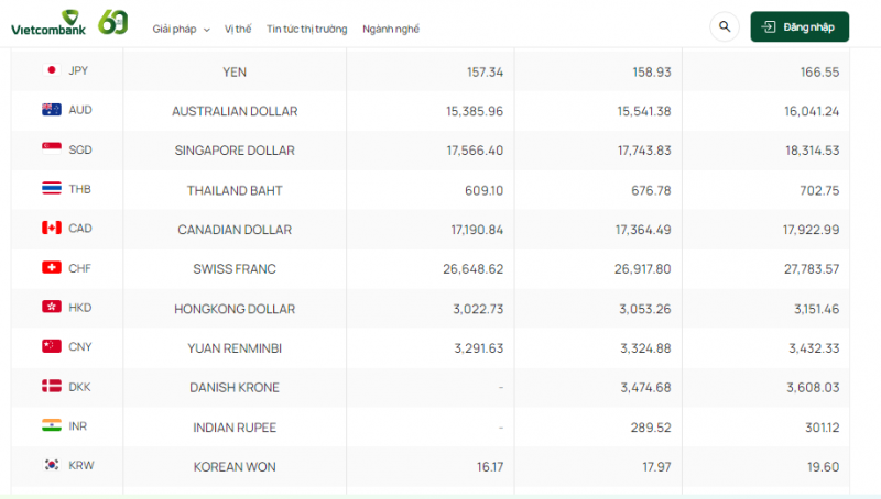 Trong số 20 ngoại tệ đang được giao dịch tại Vietcombank, chỉ có 12 loại tiền tệ được Vietcombank mua - bán bằng tiền mặt hoặc chuyển khoản đó là: Đô la Mỹ (USD), euro (EUR), nhân dân tệ (CNY), đô la Úc (AUD), bảng Anh (GBP), đô la Canada (CAD), franc Thuỵ Sĩ (CHF), đô la Singapore (SGD), won Hàn Quốc (KRW), Yên Nhật (JPY), đô la HongKong (HKD), bath Thái Lan (THB).