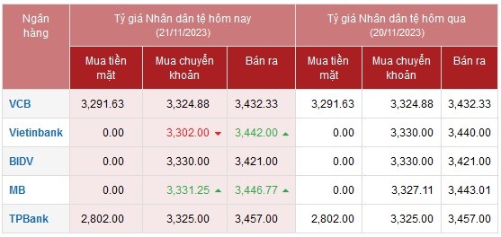 Tỷ giá Nhân dân tệ (CNY) hôm nay 21/11/2023, Ngân hàng Thương mại cổ phần Ngoại thương Việt Nam (VCB) ở chiều mua vào là 3.291,63VND/CNY và ở chiều bán ra là 3.432,33 VND/CNY, giảm nhẹ 2 đồng so với thời điểm khảo sát trưa hôm qua 20/11.
