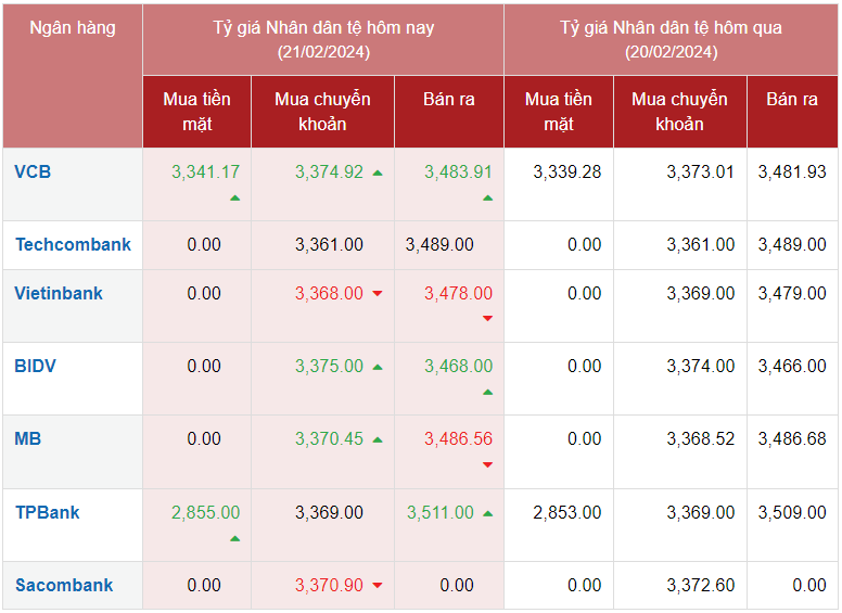 Lúc 8 giờ sáng hôm nay 21/2/2024, tỷ giá CNY tăng giảm trái chiều, mua vào có 2 ngân hàng tăng giá và 0 ngân hàng giảm giá mua, Trong khi đó, chiều bán ra có 3 ngân hàng tăng giá bán ra, 2 ngân hàng giảm giá bán và 2 ngân hàng giữ nguyên giá bán so với hôm qua.
