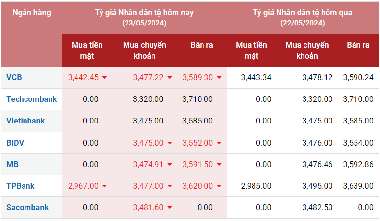 Hôm nay ngày 23/5/2024, ngân hàng mua chuyển khoản Nhân dân tệ cao nhất là ngân hàng SacomBank với mức giá 3.481,60 VNĐ/CNY.