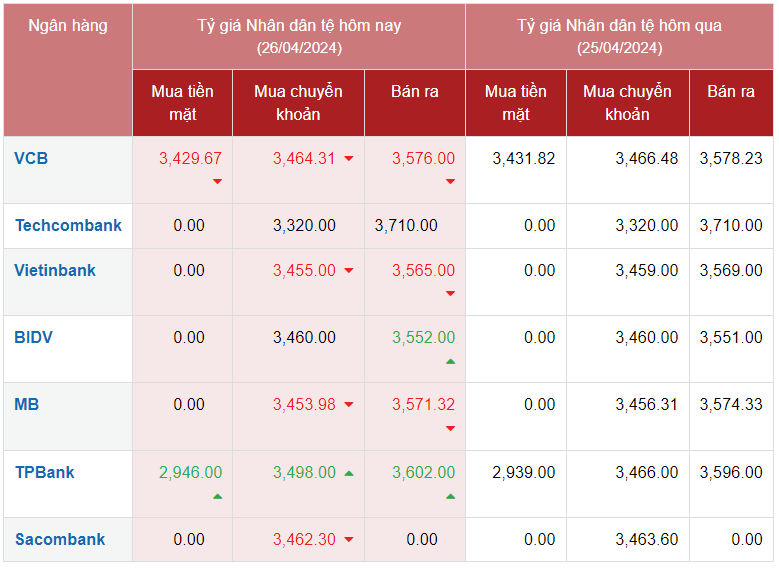 | Tỷ giá Nhân dân tệ hôm nay 26/4/2024 tại một số ngân hàng |