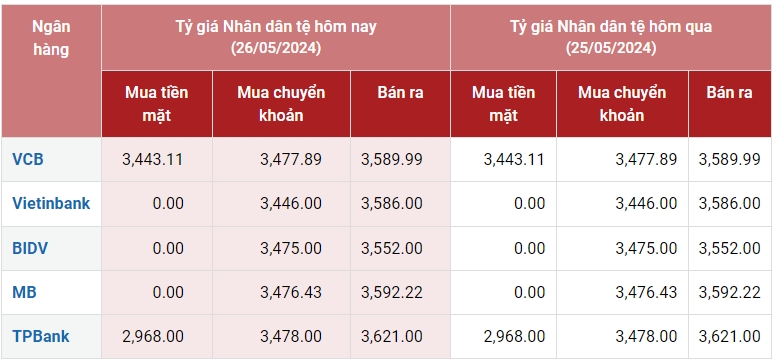 Hôm nay ngày 26/5/2024, ngân hàng mua chuyển khoản Nhân dân tệ cao nhất là ngân hàng TPBank với mức giá 3.478,00 VNĐ/CNY.