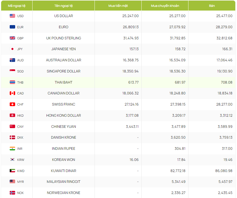 Với 8 ngoại tệ còn lại, khách hàng có thể giao dịch bằng hình thức chuyển khoản: Krone Đan Mạch (DKK), Rupee Ấn Độ (INR), Dinar Kuwaiti (KWD), Ringgit Malaysia (MYR), Krone Na Uy (NOK), Rúp Nga (RUB), Rian Ả-Rập-Xê-Út (SAR) và Krona Thụy Điển (SEK).