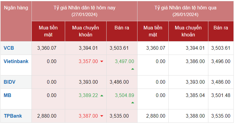 Tỷ giá Nhân dân tệ (CNY) hôm nay 27/1/2024, Ngân hàng Thương mại cổ phần Ngoại thương Việt Nam (VCB) mua vào là 3.360,07 VND/CNY và bán ra là 3.503,61 VND/CNY, giữ nguyên mức giá so với cùng thời điểm hôm trước.