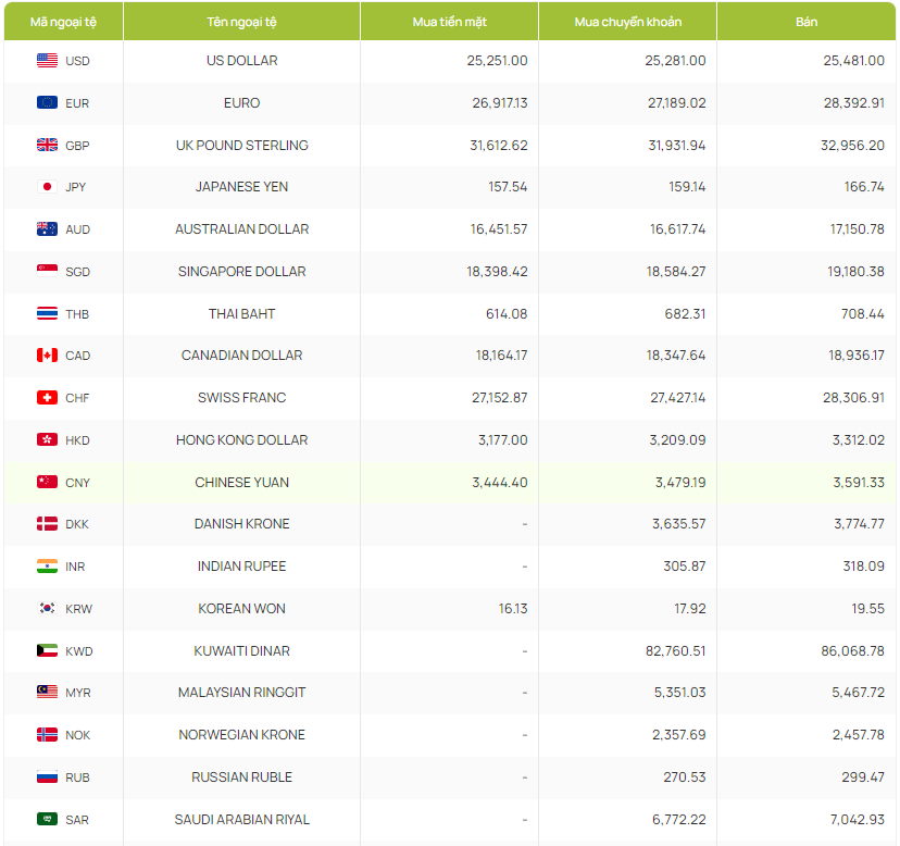 Với 8 ngoại tệ còn lại, khách hàng có thể giao dịch bằng hình thức chuyển khoản: Krone Đan Mạch (DKK), Rupee Ấn Độ (INR), Dinar Kuwaiti (KWD), Ringgit Malaysia (MYR), Krone Na Uy (NOK), Rúp Nga (RUB), Rian Ả-Rập-Xê-Út (SAR) và Krona Thụy Điển (SEK).