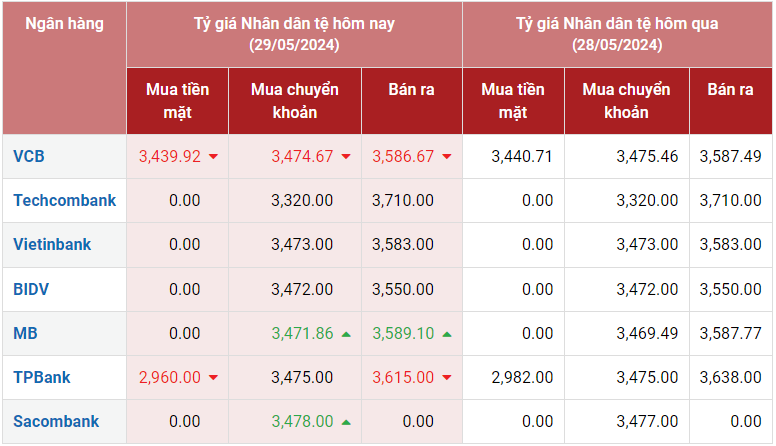 Hôm nay ngày 29/5/2024, ngân hàng mua chuyển khoản Nhân dân tệ cao nhất là ngân hàng Sacombank với mức giá 3.478,00 VND/CNY.