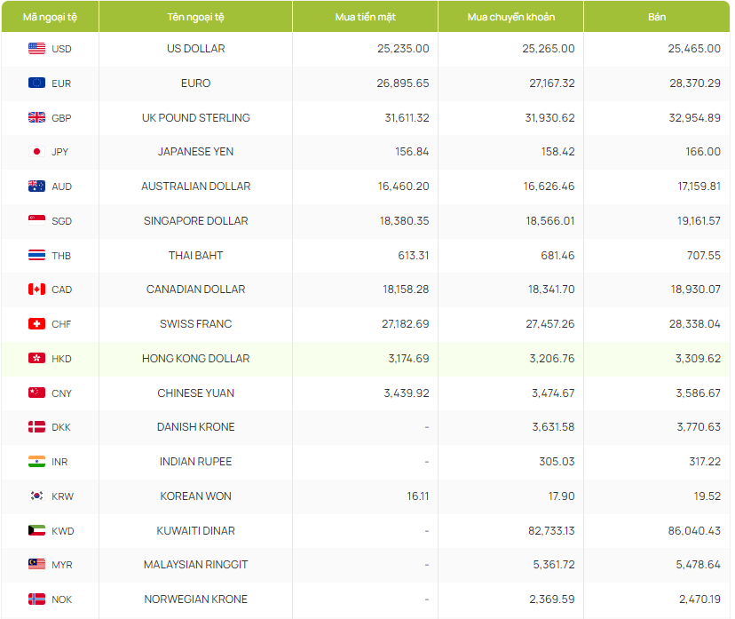 Với 8 ngoại tệ còn lại, khách hàng có thể giao dịch bằng hình thức chuyển khoản: Krone Đan Mạch (DKK), Rupee Ấn Độ (INR), Dinar Kuwaiti (KWD), Ringgit Malaysia (MYR), Krone Na Uy (NOK), Rúp Nga (RUB), Rian Ả-Rập-Xê-Út (SAR) và Krona Thụy Điển (SEK).