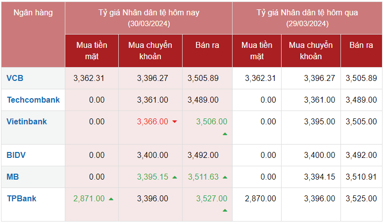 Tỷ giá Nhân dân tệ (CNY) hôm nay 30/3/2024, Ngân hàng Thương mại cổ phần Ngoại thương Việt Nam (VCB) so sánh với tỷ giá CNY cùng thời điểm vào sáng qua, tỷ giá Nhân dân tệ tại ngân hàng này giá tăng nhẹ cả 2 chiều giao dịch. Giá Nhân dân tệ VCB mua vào là 3.362,31 VND/CNY và bán ra là 3.505,89 VND/CNY.