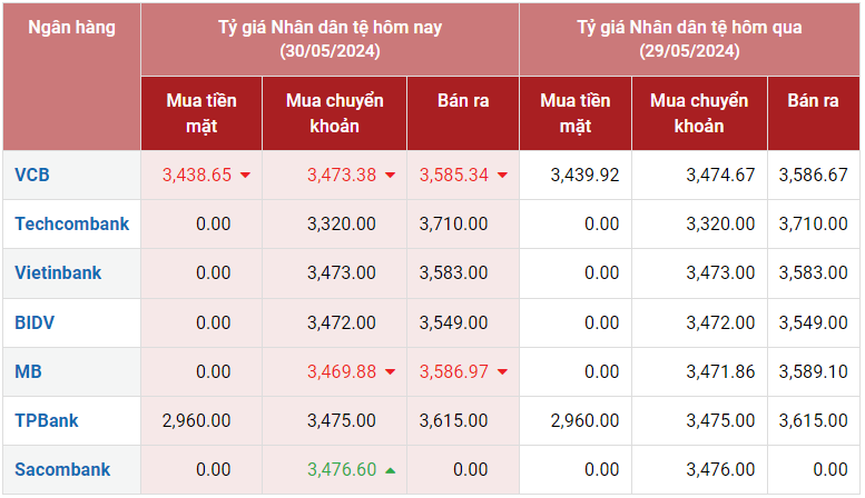 Hôm nay ngày 30/5/2024, ngân hàng mua chuyển khoản Nhân dân tệ cao nhất là ngân hàng Sacombank với mức giá 3.476,60 VND/CNY.