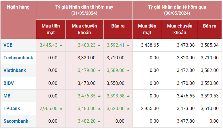 Hôm nay ngày 31/5/2024, ngân hàng mua chuyển khoản Nhân dân tệ cao nhất là ngân hàng Sacombank với mức giá 3.482,20 VND/CNY.