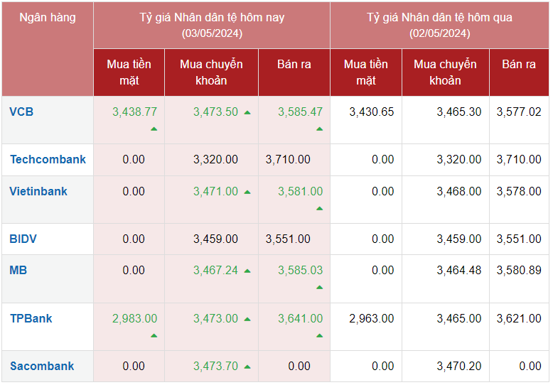 Hôm nay ngày 3/5/2024, Ngân hàng mua chuyển khoản Nhân dân tệ cao nhất hôm nay là ngân hàng Vietcombank với mức giá 3.473,50 VNĐ/CNY.