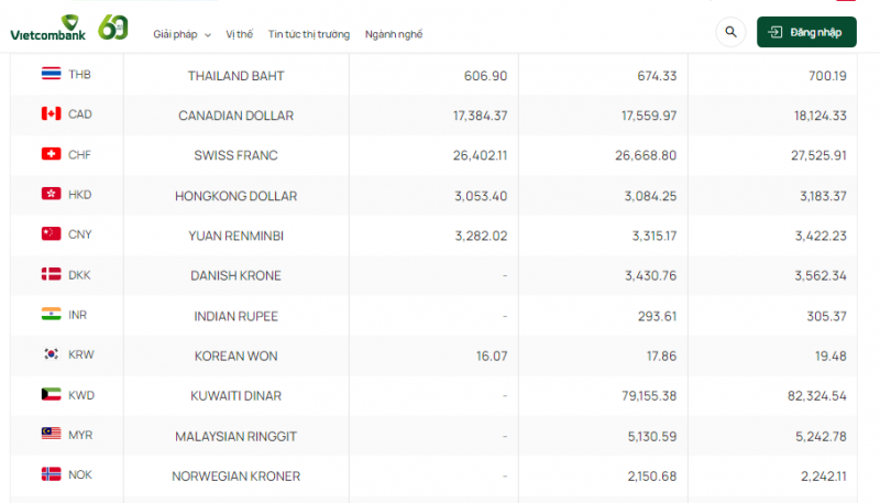 Với 8 ngoại tệ còn lại, khách hàng có thể giao dịch bằng hình thức chuyển khoản: Krone Đan Mạch (DKK), rupee Ấn Độ (INR), Dinar Kuwaiti (KWD), ringgit Malaysia (MYR), Krone Na Uy (NOK), Rúp Nga (RUB), Rian Ả-Rập-Xê-Út (SAR) và Krona Thụy Điển (SEK).