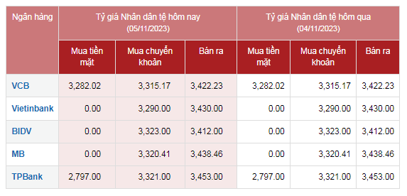 | Tỷ giá Nhân dân tệ hôm nay 5/11/2023 khảo sát tại một số ngân hàng |