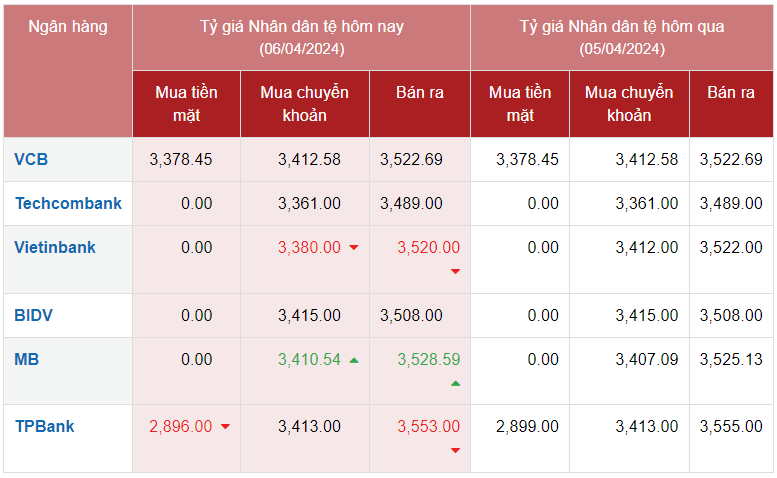 | Tỷ giá Nhân dân tệ hôm nay 6/4/2024 tại một số Ngân hàng |