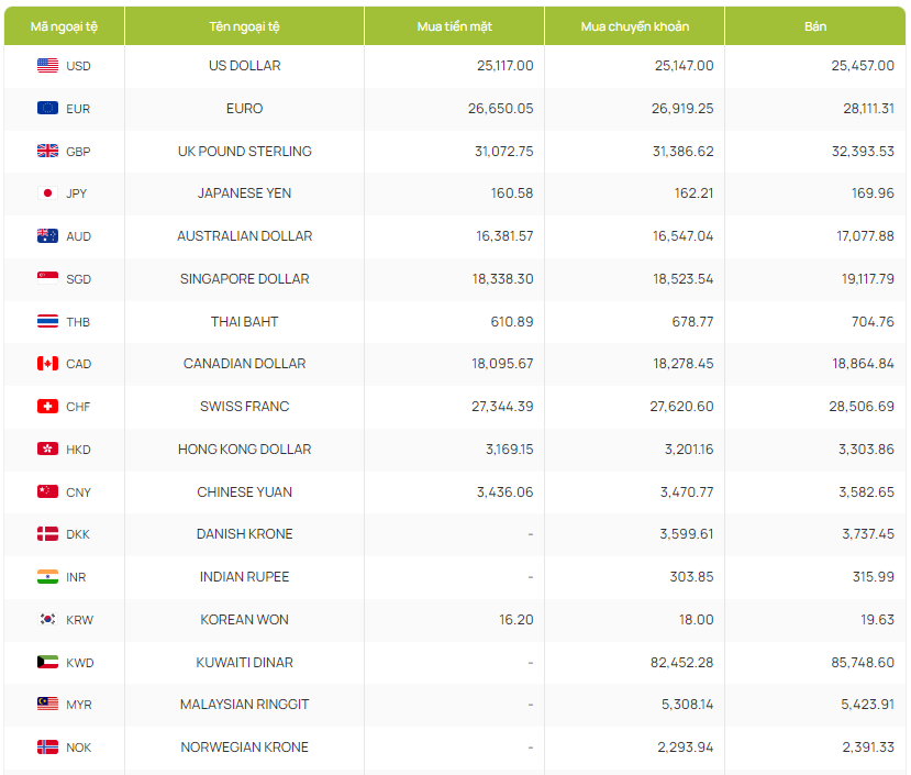 Với 8 ngoại tệ còn lại, khách hàng có thể giao dịch bằng hình thức chuyển khoản: Krone Đan Mạch (DKK), Rupee Ấn Độ (INR), Dinar Kuwaiti (KWD), Ringgit Malaysia (MYR), Krone Na Uy (NOK), Rúp Nga (RUB), Rian Ả-Rập-Xê-Út (SAR) và Krona Thụy Điển (SEK).