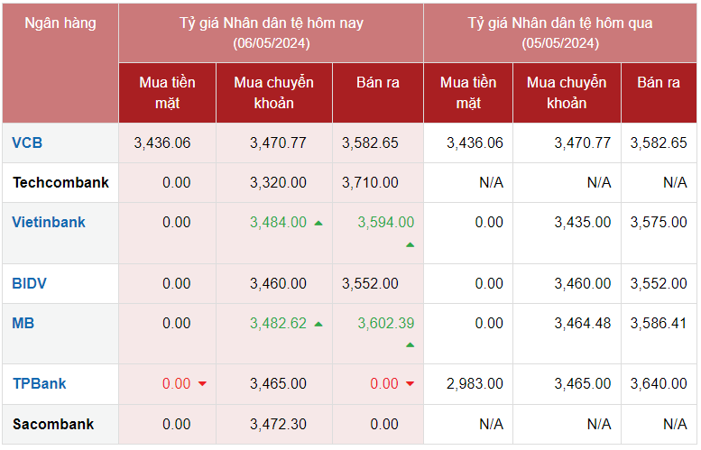 Hôm nay ngày 6/5/2024, ngân hàng mua chuyển khoản Nhân dân tệ cao nhất hôm nay là ngân hàng Vietinbank với mức giá 3.484,00 VNĐ/CNY.
