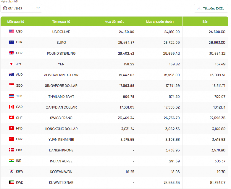 | Giá ngoại tệ đang được giao dịch tại Vietcombank cập nhật lúc 7h |