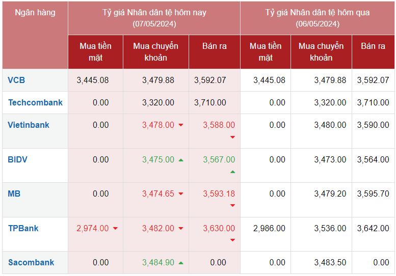 Hôm nay ngày 7/5/2024, ngân hàng mua chuyển khoản Nhân dân tệ cao nhất hôm nay là ngân hàng Sacombank với mức giá 3.484,90 VNĐ/CNY.