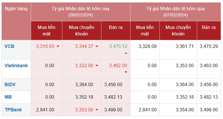 Tỷ giá Nhân dân tệ (CNY) hôm nay 8/2/2024, Ngân hàng Thương mại cổ phần Ngoại thương Việt Nam (VCB) mua vào cao nhất là 3.310,93 VND/CNY và bán ra là 3.475,12 VND/CNY, giá giảm nhẹ so với cùng thời điểm hôm trước.