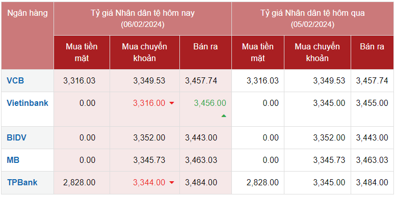 Tỷ giá Nhân dân tệ (CNY) hôm nay 6/2/2024, Ngân hàng Thương mại cổ phần Ngoại thương Việt Nam (VCB) mua vào cao nhất là 3.316,03 VND/CNY và bán ra là 3.457,74 VND/CNY, giá giữ nguyên so với cùng thời điểm hôm trước.