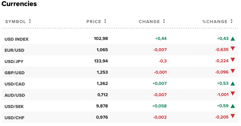 Hiện 1 euro đổi 1,065 USD. 1 bảng Anh đổi 1,253 USD. 1 USD đổi 133,94 yên. 1 USD đổi 1,262 đô la Canada. 1 đô la Úc đổi 0,712 USD, 1 USD đổi 0,976 France Thụy Sĩ.