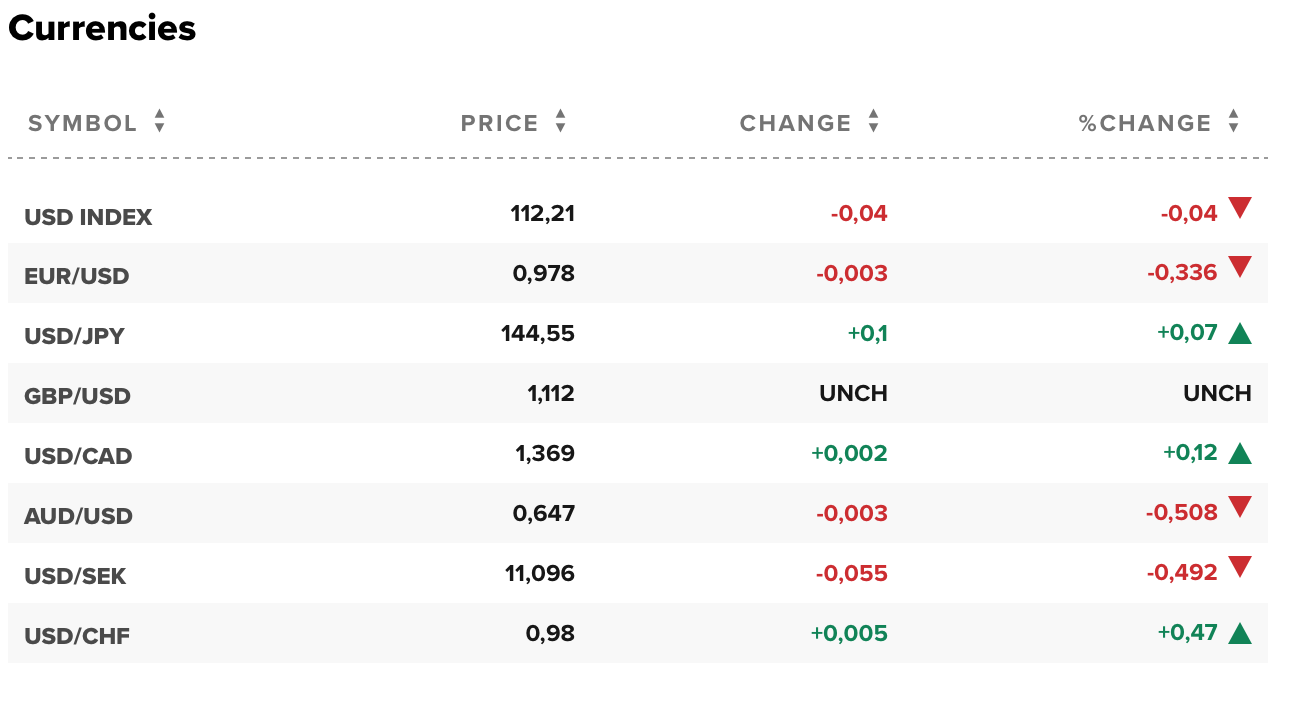 Hiện 1 euro đổi 0,978 USD. 1 bảng Anh đổi 1,112 USD. 1 USD đổi 144,55 yên. 1 USD đổi 1,369 đô la Canada. 1 đô la Úc đổi 0,647 USD, 1 USD đổi 0,98 France Thụy Sĩ.