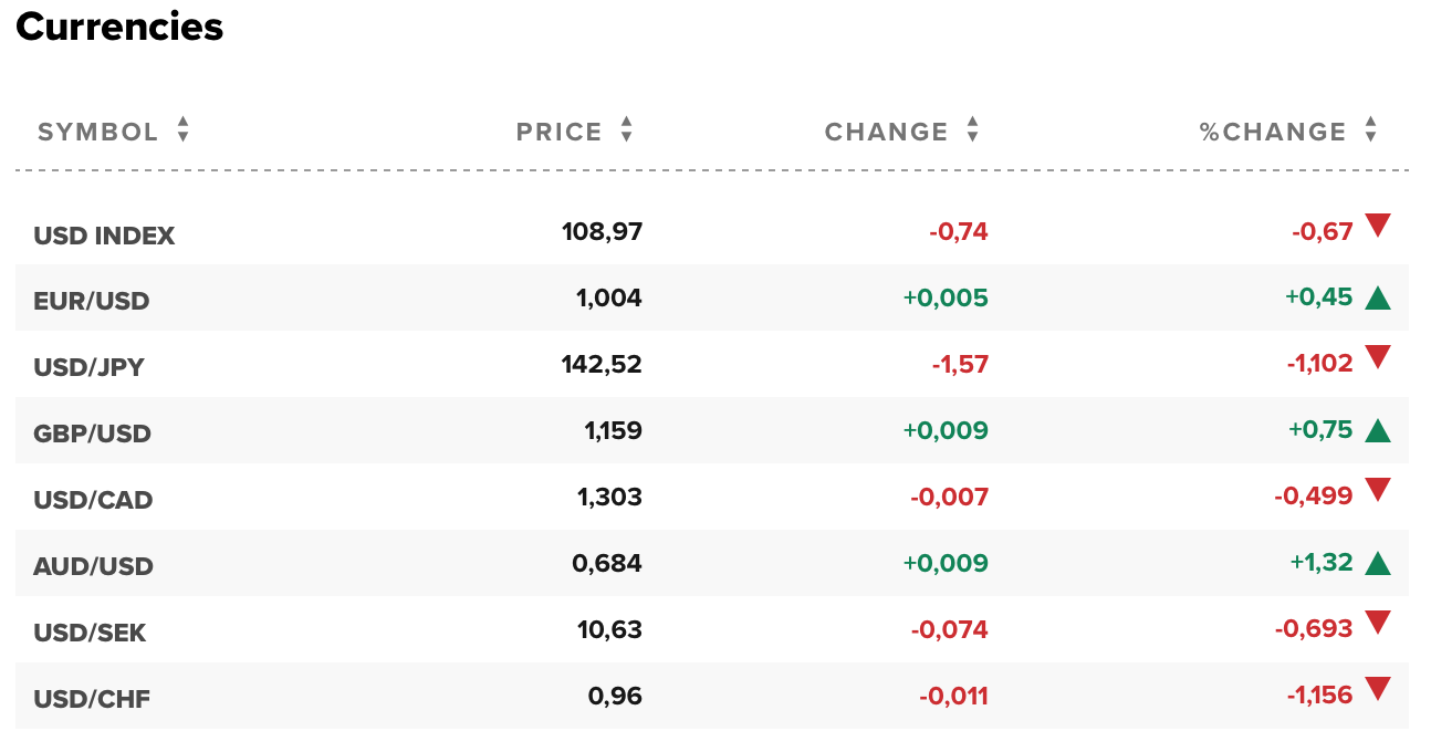 Hiện 1 euro đổi 1,004 USD. 1 bảng Anh đổi 1,159 USD. 1 USD đổi 142,52 yên. 1 USD đổi 1,303 đô la Canada. 1 đô la Úc đổi 0,684 USD, 1 USD đổi 0,96 France Thụy Sĩ.