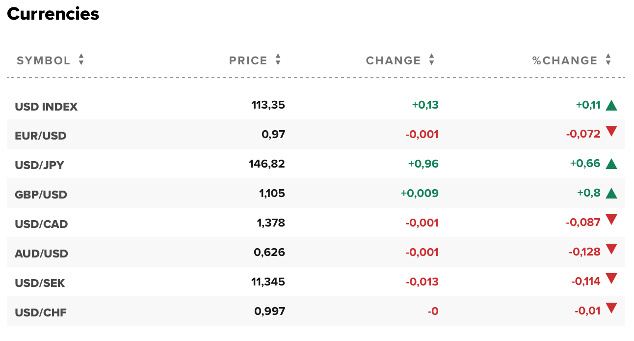 Hiện 1 euro đổi 0,97 USD. 1 bảng Anh đổi 1,105 USD. 1 USD đổi 146,82 yên. 1 USD đổi 1,378 đô la Canada. 1 đô la Úc đổi 0,626 USD, 1 USD đổi 0,997 France Thụy Sĩ.