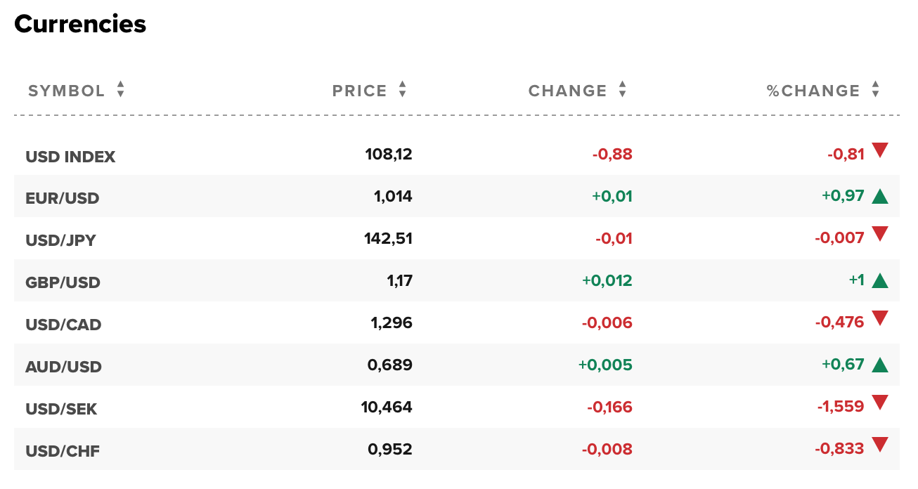 Hiện 1 euro đổi 1,014 USD. 1 bảng Anh đổi 1,17 USD. 1 USD đổi 142,51 yên. 1 USD đổi 1,296 đô la Canada. 1 đô la Úc đổi 0,689 USD, 1 USD đổi 0,952 France Thụy Sĩ.