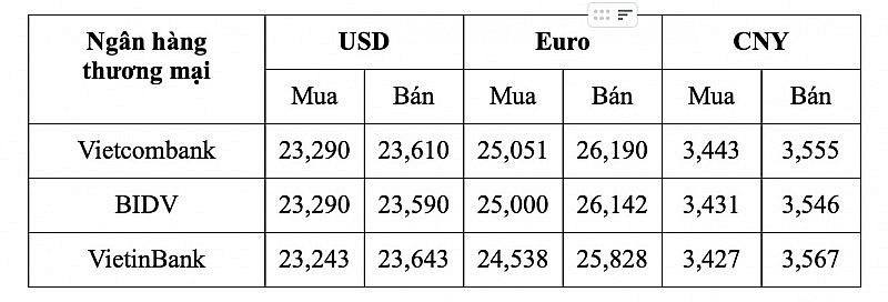 Tỷ giá USD tại các ngân hàng thương mại mua vào và bán ra như sau:
