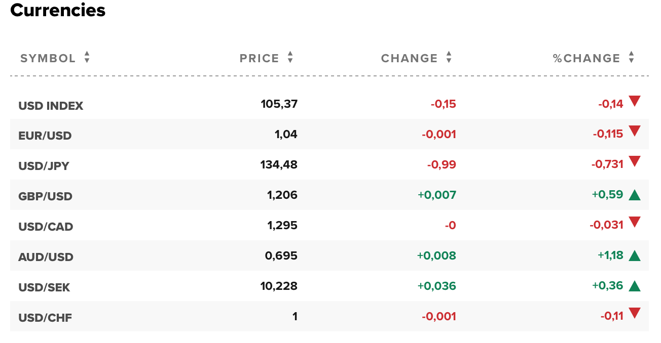 Hiện 1 euro đổi 1,04 USD. 1 bảng Anh đổi 1,206 USD. 1 USD đổi 134,48 yên. 1 USD đổi 1,295 đô la Canada. 1 đô la Úc đổi 0,695 USD, 1 USD đổi 1 France Thụy Sĩ.