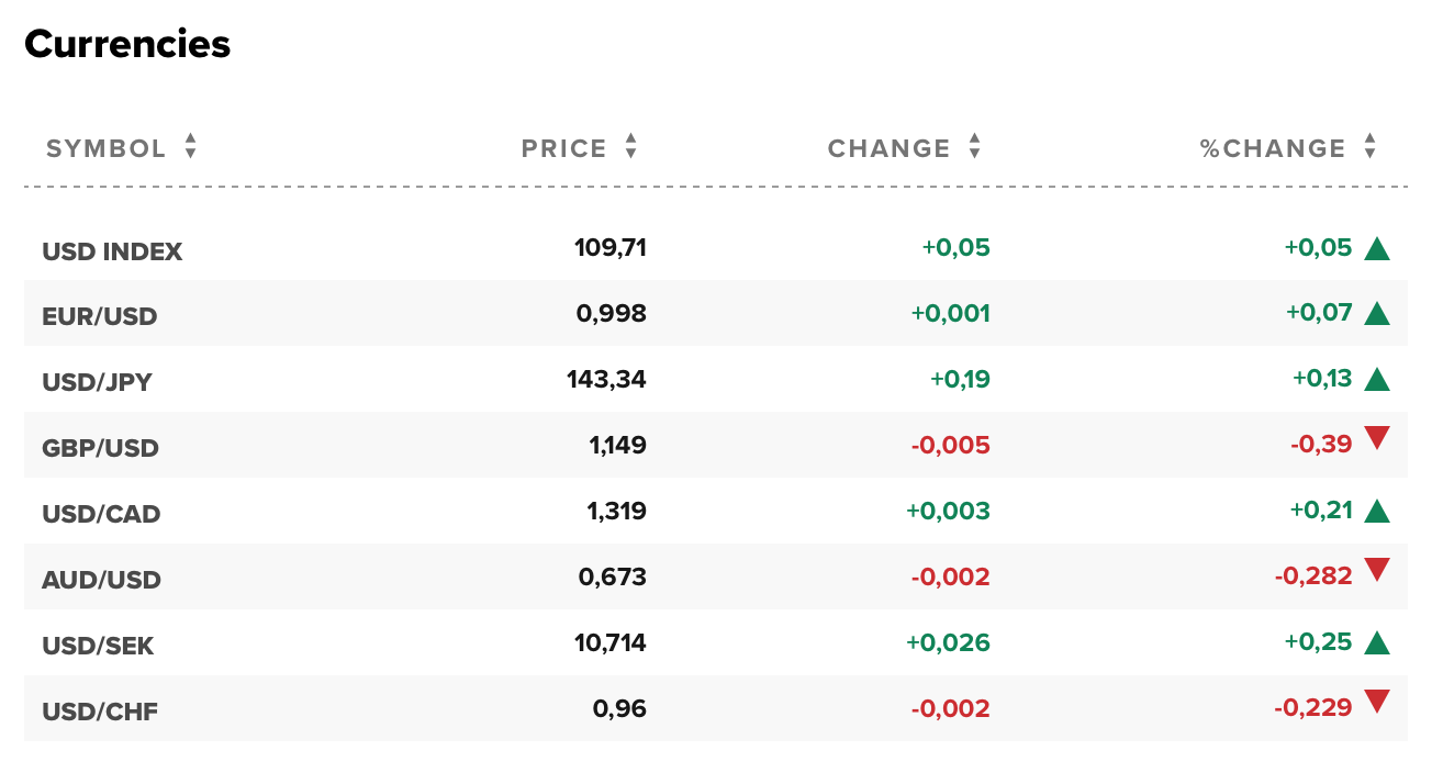 Hiện 1 euro đổi 0,998 USD. 1 bảng Anh đổi 1,149 USD. 1 USD đổi 143,34 yên. 1 USD đổi 1,319 đô la Canada. 1 đô la Úc đổi 0,673 USD, 1 USD đổi 0,96 France Thụy Sĩ.