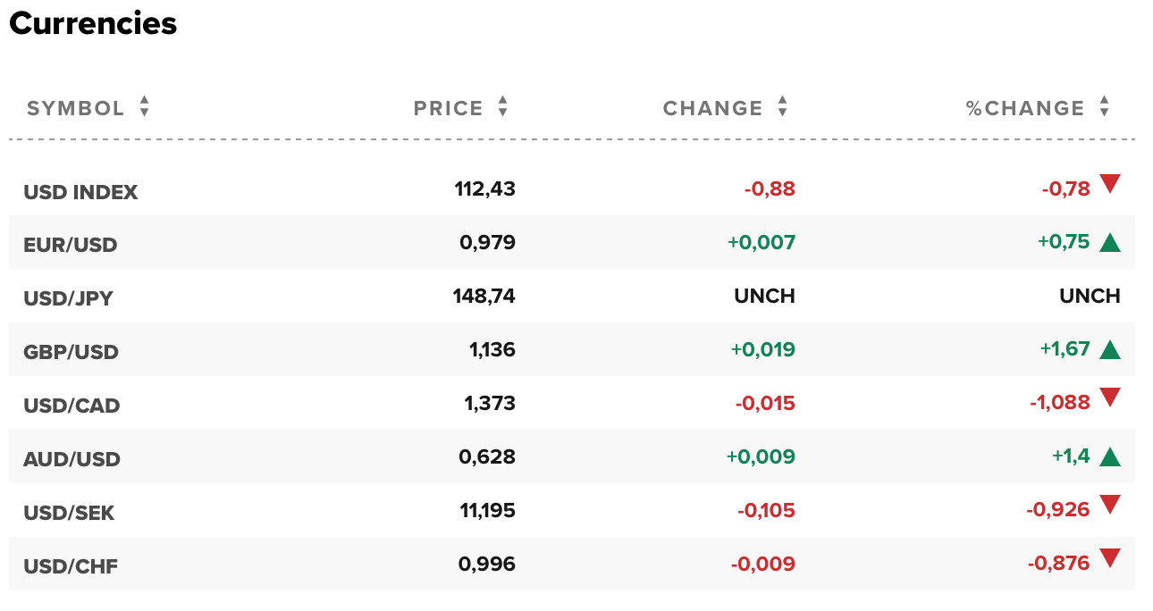 Hiện 1 euro đổi 0,979 USD. 1 bảng Anh đổi 1,136 USD. 1 USD đổi 148,74 yên. 1 USD đổi 1,373 đô la Canada. 1 đô la Úc đổi 0,628 USD, 1 USD đổi 0,996 France Thụy Sĩ.