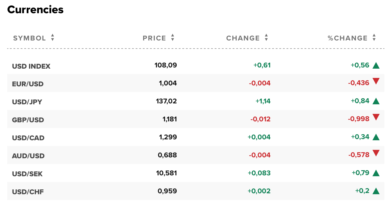 Hiện 1 euro đổi 1,004 USD. 1 bảng Anh đổi 1,181 USD. 1 USD đổi 137,02 yên. 1 USD đổi 1,299 đô la Canada. 1 đô la Úc đổi 0,688 USD, 1 USD đổi 0,959 France Thụy Sĩ.