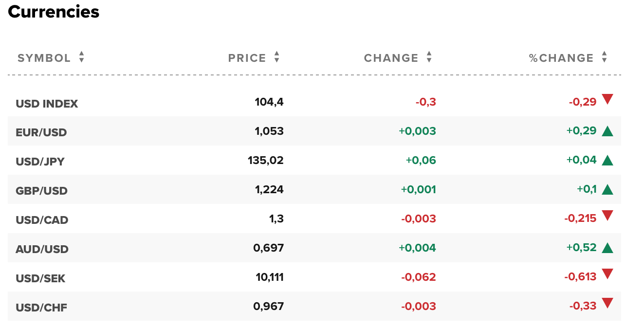 Hiện 1 euro đổi 1,053 USD. 1 bảng Anh đổi 1,224 USD. 1 USD đổi 135,02 yên. 1 USD đổi 1,3 đô la Canada. 1 đô la Úc đổi 0,697 USD, 1 USD đổi 0,967 France Thụy Sĩ.