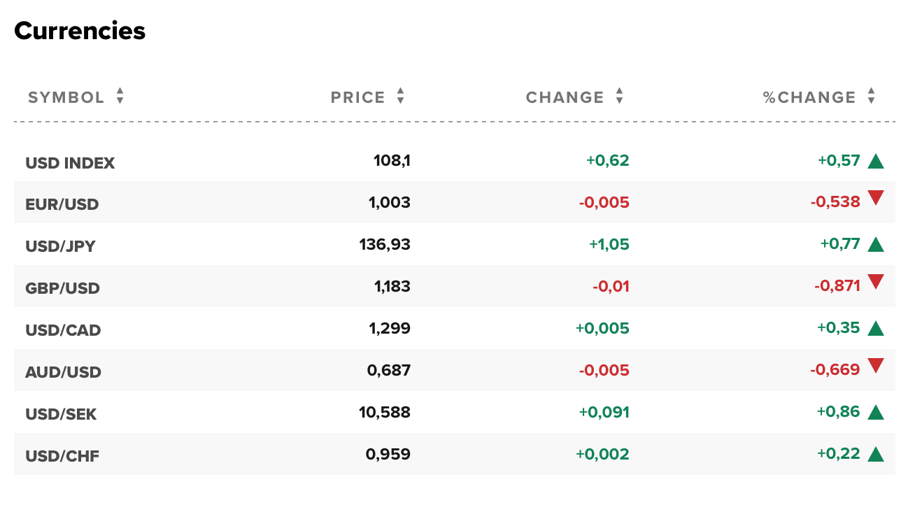Hiện 1 euro đổi 1,003 USD. 1 bảng Anh đổi 1,183 USD. 1 USD đổi 136,93 yên. 1 USD đổi 1,299 đô la Canada. 1 đô la Úc đổi 0,687 USD, 1 USD đổi 0,959 France Thụy Sĩ.