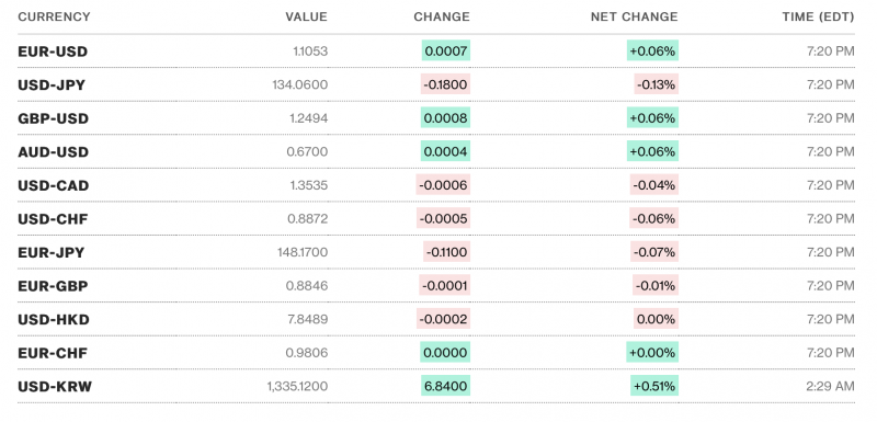 Hiện 1 Euro đổi 1,1053 USD. 1 bảng Anh đổi 1,2494 USD. 1 USD đổi 134,060 Yên. 1 USD đổi 1,3535 Đô la Canada. 1 Đô la Úc đổi 0,6700 USD.