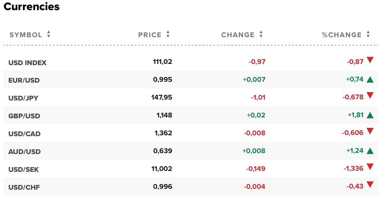 Hiện 1 euro đổi 0,995 USD. 1 bảng Anh đổi 1,148 USD. 1 USD đổi 147,95 yên. 1 USD đổi 1,362 đô la Canada. 1 đô la Úc đổi 0,639 USD, 1 USD đổi 0,996 France Thụy Sĩ.
