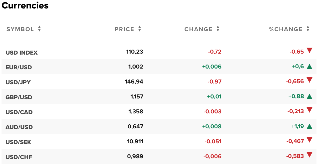 Hiện 1 euro đổi 1,002 USD. 1 bảng Anh đổi 1,157 USD. 1 USD đổi 146,95 yên. 1 USD đổi 1,358 đô la Canada. 1 đô la Úc đổi 0,647 USD, 1 USD đổi 0,989 France Thụy Sĩ.