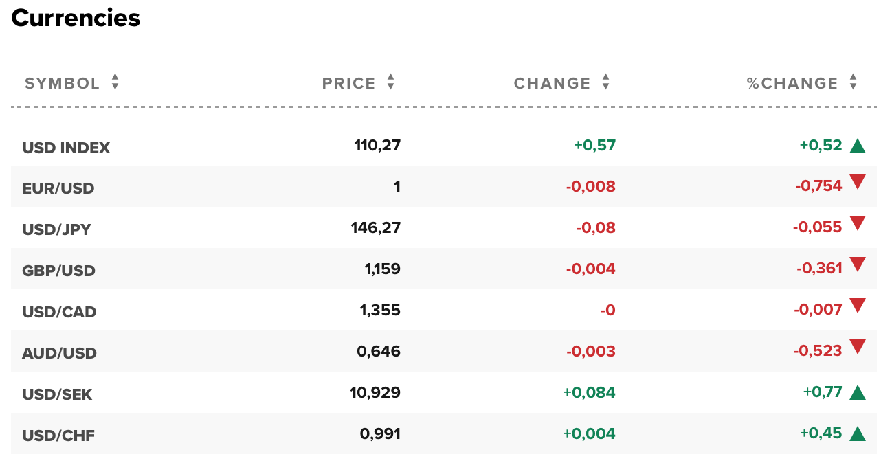 Hiện 1 euro đổi 1 USD. 1 bảng Anh đổi 1,159 USD. 1 USD đổi 146,27 yên. 1 USD đổi 1,355 đô la Canada. 1 đô la Úc đổi 0,646 USD, 1 USD đổi 0,991 France Thụy Sĩ.