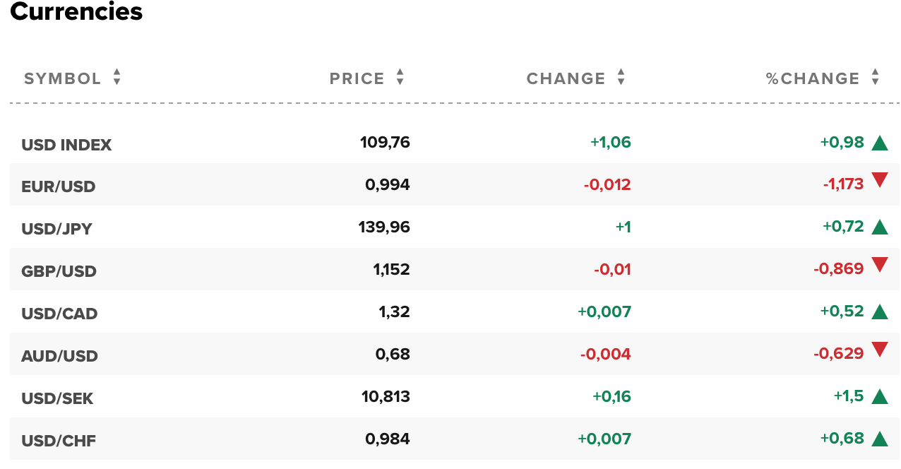 Hiện 1 euro đổi 0,994 USD. 1 bảng Anh đổi 1,152 USD. 1 USD đổi 139,96 yên. 1 USD đổi 1,32 đô la Canada. 1 đô la Úc đổi 0,68 USD, 1 USD đổi 0,984 France Thụy Sĩ.