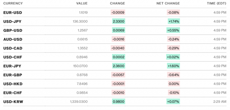 Hiện 1 Euro đổi 1,1019 USD. 1 bảng Anh đổi 1,2567 USD. 1 USD đổi 136,300 Yên. 1 USD đổi 1,3552 Đô la Canada. 1 Đô la Úc đổi 0,6615 USD.