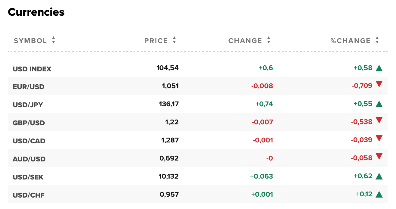 Hiện 1 euro đổi 1,051 USD. 1 bảng Anh đổi 1,22 USD. 1 USD đổi 136,17 yên. 1 USD đổi 1,287 đô la Canada. 1 đô la Úc đổi 0,692 USD, 1 USD đổi 0,957 France Thụy Sĩ.